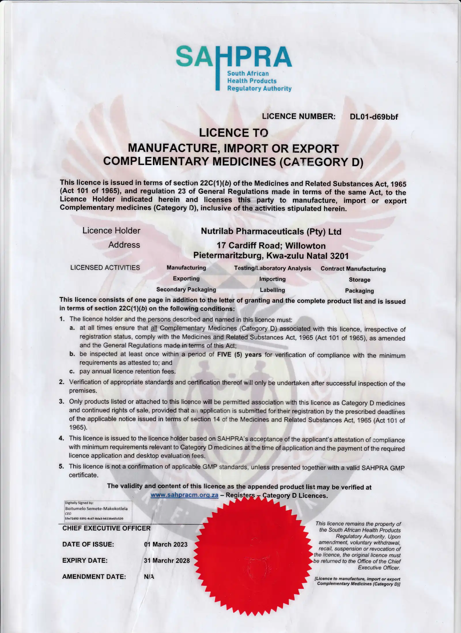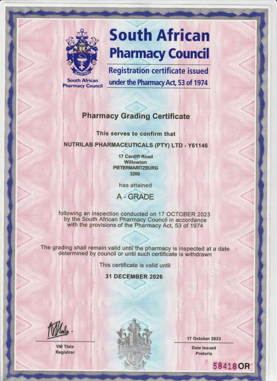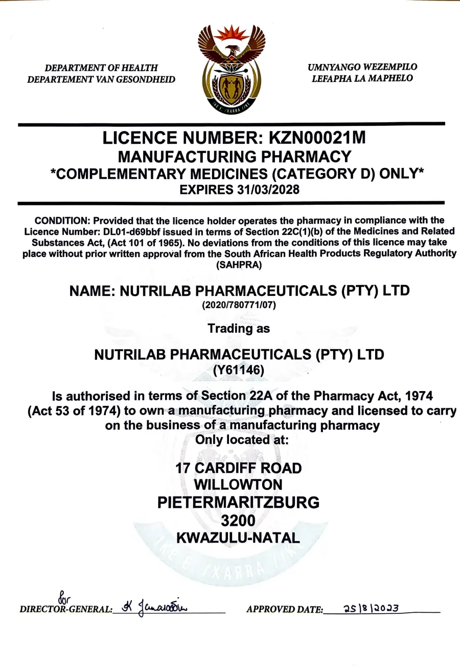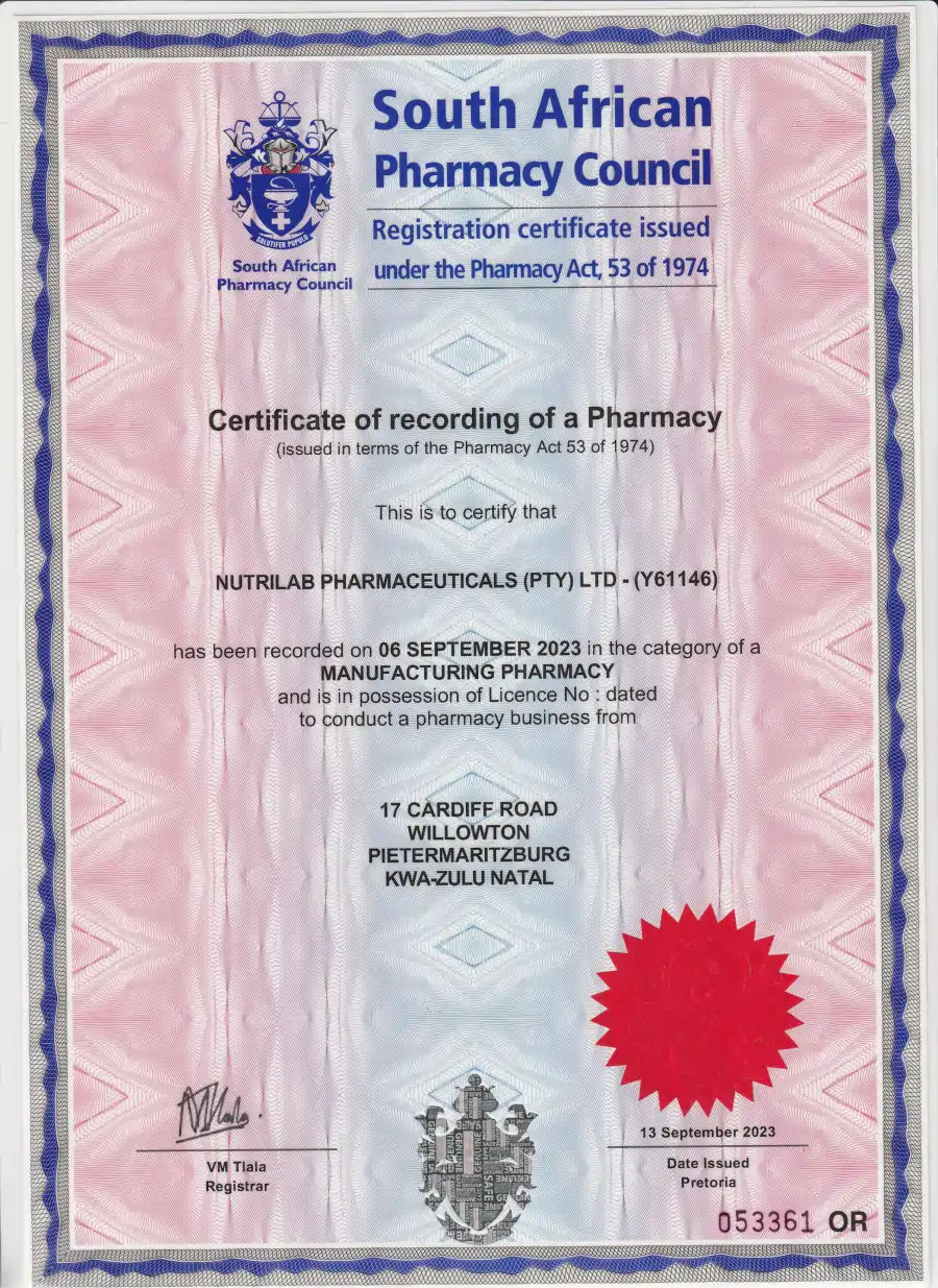 Nutrilab Pharmaceuticals (Pty) Ltd is a registered pharmaceutical company with the South African Pharmacy Council, and manufactures and pack oral solid dosage complementary medication in capsule and sachets.